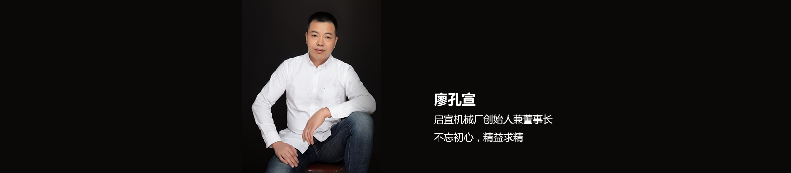 - 廖孔宣-瑞安市啟宣機械有限公司創始人兼董事長。 1989年在溫州梧田撕裂膜廠做工,2005年自己創辦了鵬博機械廠,誠信經營,不忘初心,精益求精。之后機械廠正式改名瑞安市啟宣機械有限公司。